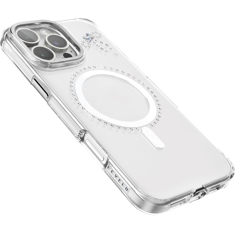 جراب Levelo Butterfly Magsafe لهاتف iPhone 16 Pro بلمسة نهائية من الكريستال الفاخر، ومواد TPU فائقة الرقة، وكريستالات سواروفسكي، وتقنية Clearview، ومغناطيس Magsafe قوي - شفاف