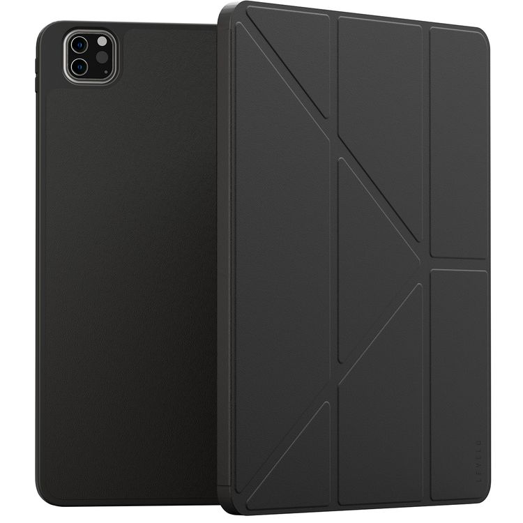 غطاء Levelo Elegante Hybrid من الجلد لجهاز iPad Pro 12.9" (الجيل الرابع إلى السادس)، وضعية عمودية وأفقية، غطاء ممتص للصدمات، حماية بزاوية 360°، سهل التثبيت بالنقر، فتحات دقيقة - لون أسود
