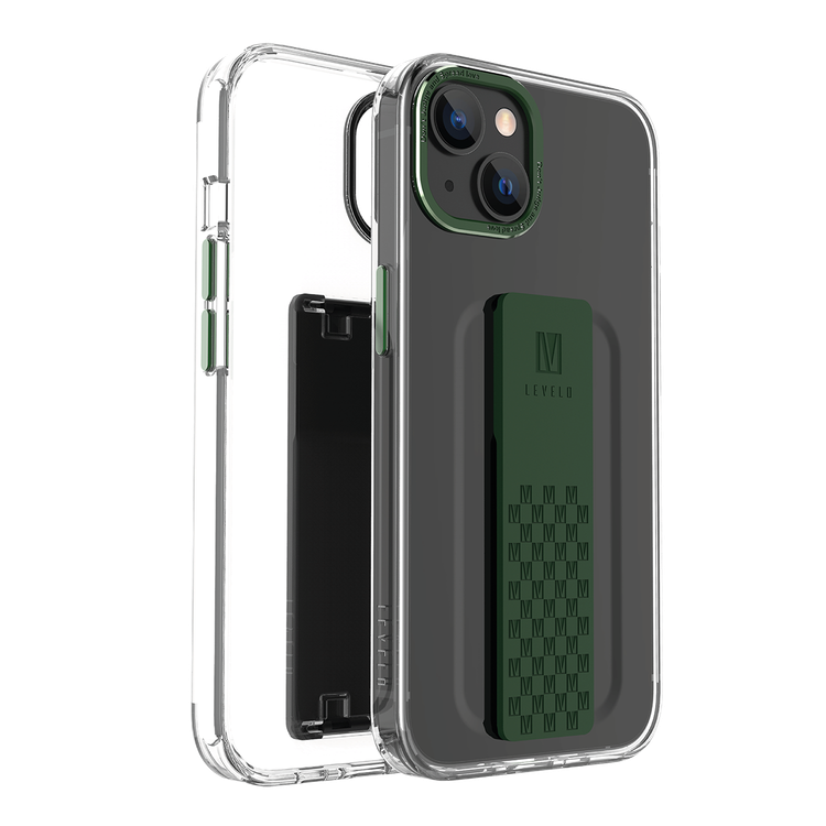 غطاء ليفيلو جرافيا IMD الشفاف مع قبضة إضافية لجهاز آيفون 14 بلس - أخضر