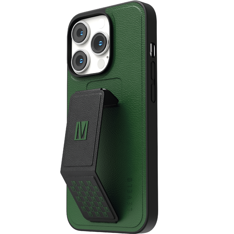 غطاء Levelo Morphix Gripstand مصنوع من جلد PU لهاتف iPhone 14 Pro Max - لون أخضر غامق