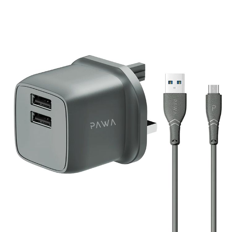 شاحن سفر PAWA PocketMini ثنائي USB بمعايير المملكة المتحدة من UAB-A إلى كابل Micro - رمادي