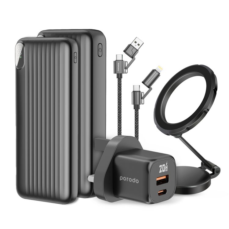 بورودو 6 أساسيات في 1 مجموعة نهائية بشاحن مزدوج المنافذ GaN، حامل مغناطيسي MagSafe، بنوك طاقة بسعة 10000mAh و20000mAh، كابل شحن بطول 1.2 متر، حقيبة سفر متضمنة - أسود