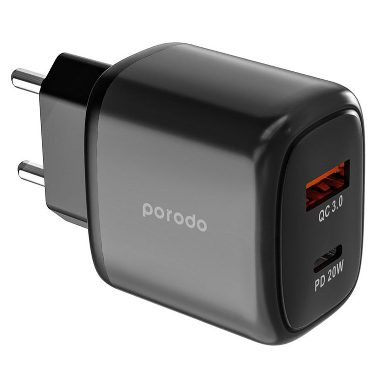 شاحن بورودو ثنائي المخرج للشحن السريع مع توصيل طاقة بقوة 20 واط، QC 18 واط، قابس 2-دبوس من الاتحاد الأوروبي، شحن متزامن، حماية من الحرارة الزائدة، منفذ USB-A QC بقوة 18 واط، رفيق موثوق - أسود