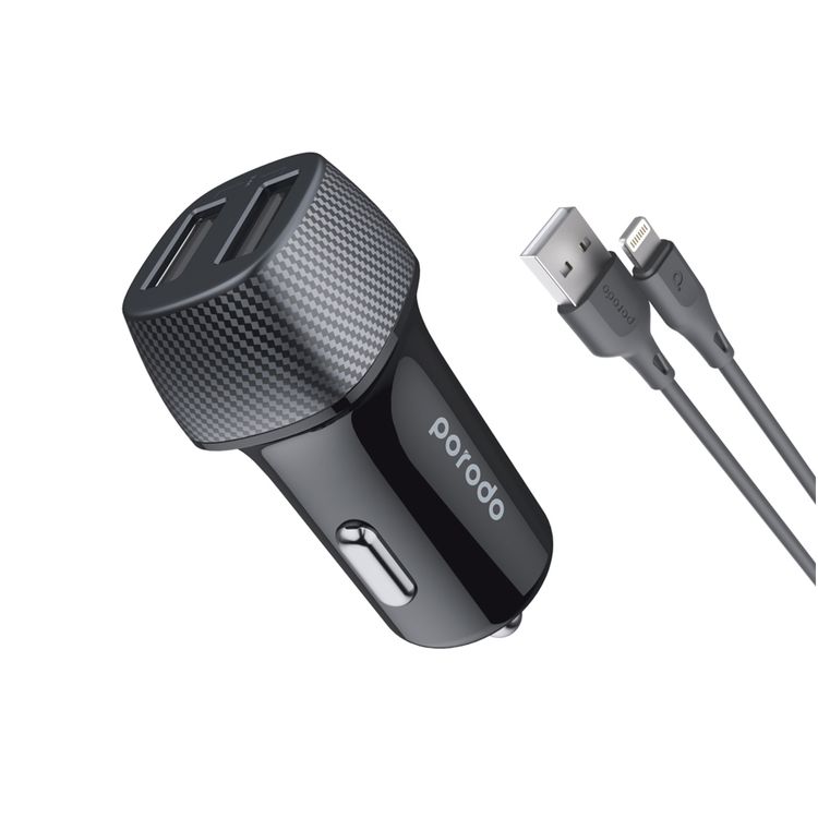 شاحن سيارة بورودو بمخرجين مع كابل لايتنينج بطول 90 سم، يمنع ارتفاع درجة الحرارة، الشحن الزائد، وقصر الدائرة، تصميم من الألياف الكربونية، متوافق عالميًا، مدمج وخفيف الوزن - أسود