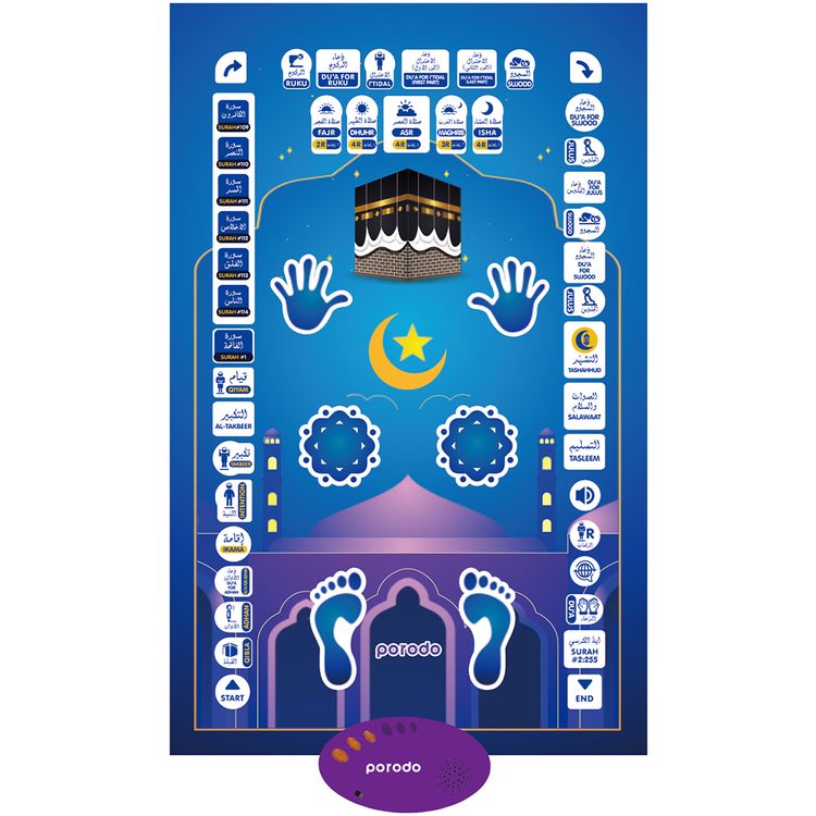 سجادة صلاة ذكية تفاعلية تعليمية من بورودو للأطفال مع أدعية وسور مسجلة مسبقاً، 51 مفتاح حساس للمس، دعم لـ7 لغات، مصممة لجميع الصلوات الخمس اليومية، ميزة التشغيل التلقائي، ضبط مستوى الصوت، برنامج صلاة شامل - أزرق