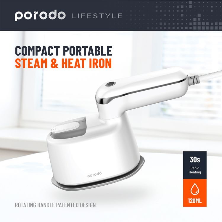 مكواة بخار صغيرة من بورودو لايف ستايل UK بقدرة 1000 واط مع مقبض قابل للدوران، صغيرة الحجم وقابلة للحمل، بخار قوي، سعة خزان مياه 120 مل، قاعدة سيراميك، طول الكابل 1.7 متر - أبيض