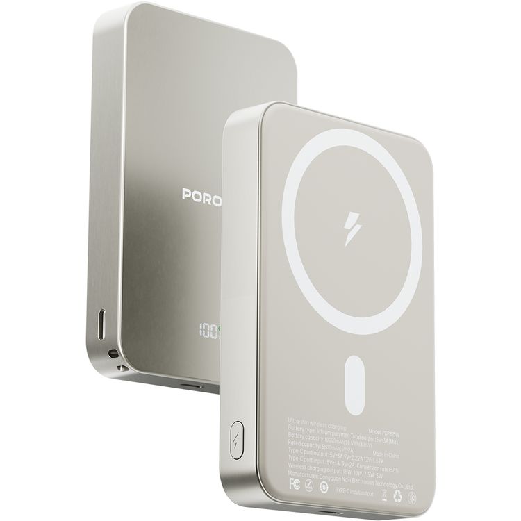 بنك طاقة بورودو ماج سيف 10000 مللي أمبير/ساعة مع منفذ إدخال وإخراج من النوع C، شحن لاسلكي 15 وات وشحن PD 20 وات، مؤشر بطارية LED، تصميم صغير الحجم وقابل للحمل - فضي / أصفر