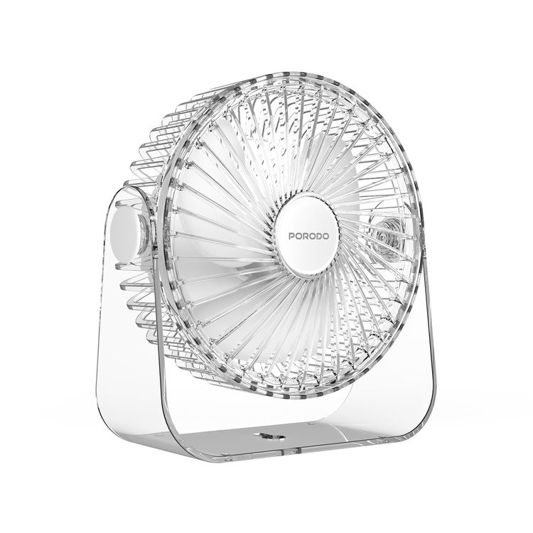مروحة تبريد محمولة شفافة من Porodo مع ضوء ليلي، دوران بزاوية 120°، 3 مستويات سرعة، سعة بطارية 3000 مللي أمبير، وقت تشغيل 3-9.5 ساعات، وقت شحن 2.5 ساعات، مادة ABS، واجهة شحن Type-C، تشغيل هادئ - شفاف