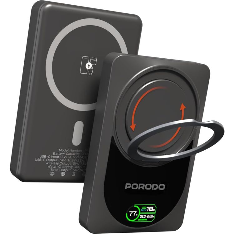 بنك طاقة لاسلكي Porodo Qi2 بسعة 10000 مللي أمبير/ساعة مع شاشة TFT ذكية في الوقت الفعلي، مدخل ومخرج Type-C، شحن سريع 20 وات PD، شحن لاسلكي 15 وات، مخرج شحن ساعة ذكية بحد أقصى 2.5 وات، حامل حلقي دوار 360 درجة - رمادي غامق