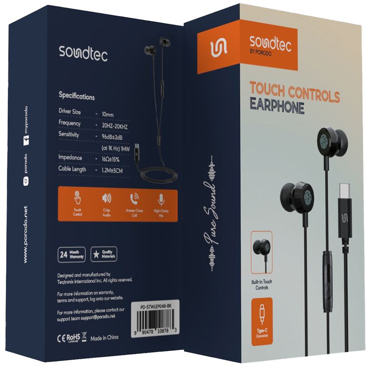 سماعات الأذن بورودو سوندتك مع التحكم باللمس المدمج، ميكروفون عالي الوضوح، إجابة سريعة للمكالمات، صوت نقي، طول الكابل 1.2 متر، موصل Type-C - لون أسود