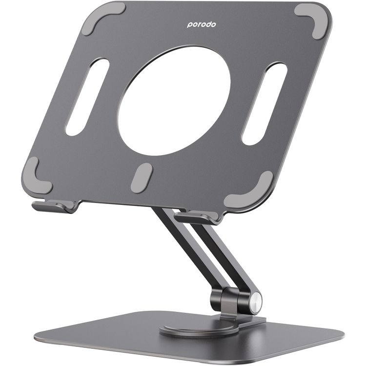 حامل الكمبيوتر اللوحي Porodo مع حامل من سبائك الألومنيوم، وزاوية قابلة للتعديل، ودوران 360 درجة - رمادي