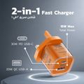 شاحن جداري سريع Porodo TEZCLARTÉ بمنفذين للشحن السريع، هيكل مقاوم للحريق، تصميم شفاف، مخرج USB-C بقوة 30 وات بتقنية PD، مخرج USB-A بقوة 20 وات بتقنية QC - برتقالي