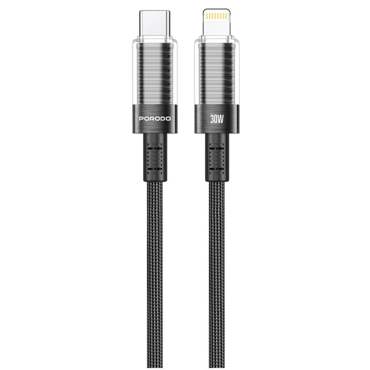 كابل USB-C إلى Lightning شفاف من Porodo، بطول 1.2 متر، متوافق عالميًا، PD 30W، آمن ومضمون، شاحن سريع للبيانات - أسود
