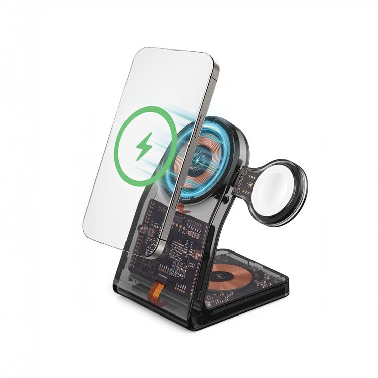 حامل شحن لاسلكي شفاف من Porodo مع طاقة شحن لاسلكية بقوة 15 وات، وشحن متعدد الأجهزة، ومخرج سماعات بقوة 3 وات، وتصميم شفاف، ومخرج Type-C بقوة 2.5 وات - باللون الأسود.