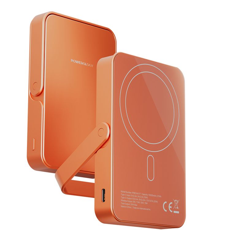 باورولوجي شاحن محمول بقدرة 10000 مللي أمبير في الساعة مع سطح زجاجي ماجسيف وتصميم مضغوط، يدعم منافذ الإخراج من نوع C واللا سلكية، يحتوي على حامل مدمج مصنوع من الألمنيوم، يدعم تقنية توصيل الطاقة بقدرة 20 واط، بدون أسلاك - برتقالي.