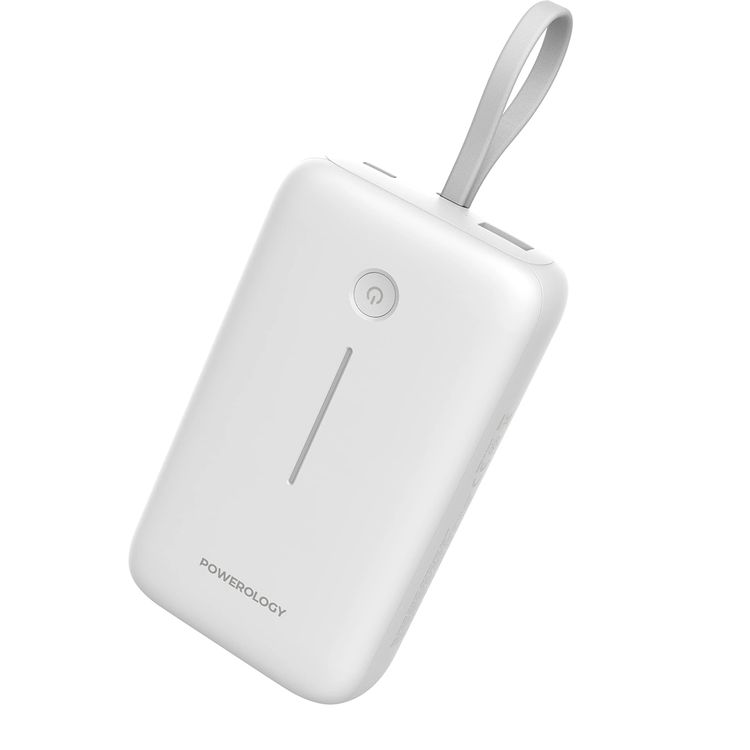 باور بانك 20000 مللي أمبير في الساعة من باورولوجي مع سلك USB-C قابل للفصل، وتوصيل طاقة بقوة 30 وات، وشحن 3 أجهزة، وضمانات مدمجة، وتوافق عالمي مع الهاتف، ووضع استعداد طويل الأمد - أبيض