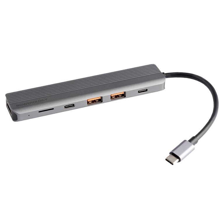 موزع USB-C رفيع 6 في 1 من Powerology مع منفذ HDMI فائق الدقة 4K، وPD 100 وات، وبيانات USB-C فائقة السرعة v3.2 بسرعة 10 جيجابت في الثانية، ومنفذان USB-C فائقان السرعة v3.2 بسرعة 10 جيجابت في الثانية، وHDMI بدقة 4K فائقة الدقة بتردد 60 هرتز، ويدعم بطاقة MicroSD v3.0، وبيانات سريعة وشحن - رمادي