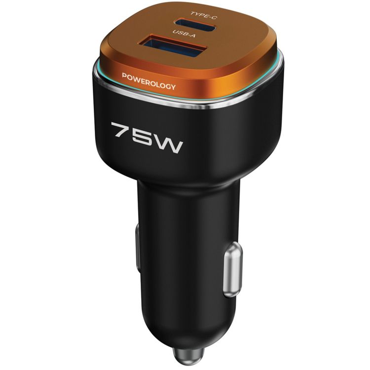 شاحن سيارة عالي القوة من باورولوجي 75 واط بمنفذين، منافذ USB-C وUSB-A، طاقة إجمالية 75 واط، توصيل طاقة 45 واط، ضوء محيط LED، شحن سريع، سبيكة الزنك بلمسة نهائية طلاء زيتي - أسود / برتقالي