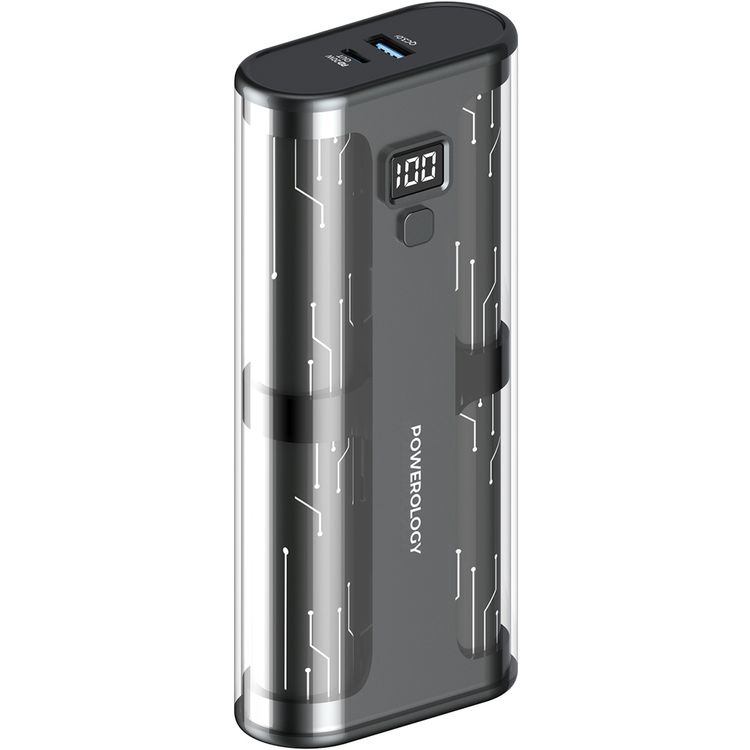 بنك طاقة سلسلة كريستالين من باورولوجي، 20000 مللي أمبير/ساعة، 65 واط PD، شاشة رقمية، مخرجين USB C وUSB-A، مدخل USB-C2 65 واط، مخرج USB-C1 PD 65 واط، مخرج USB-C2 PD 20 واط، مخرج USB-A QC 18 واط، SCP 22.5 واط، محمول، تصميم شفاف - أسود