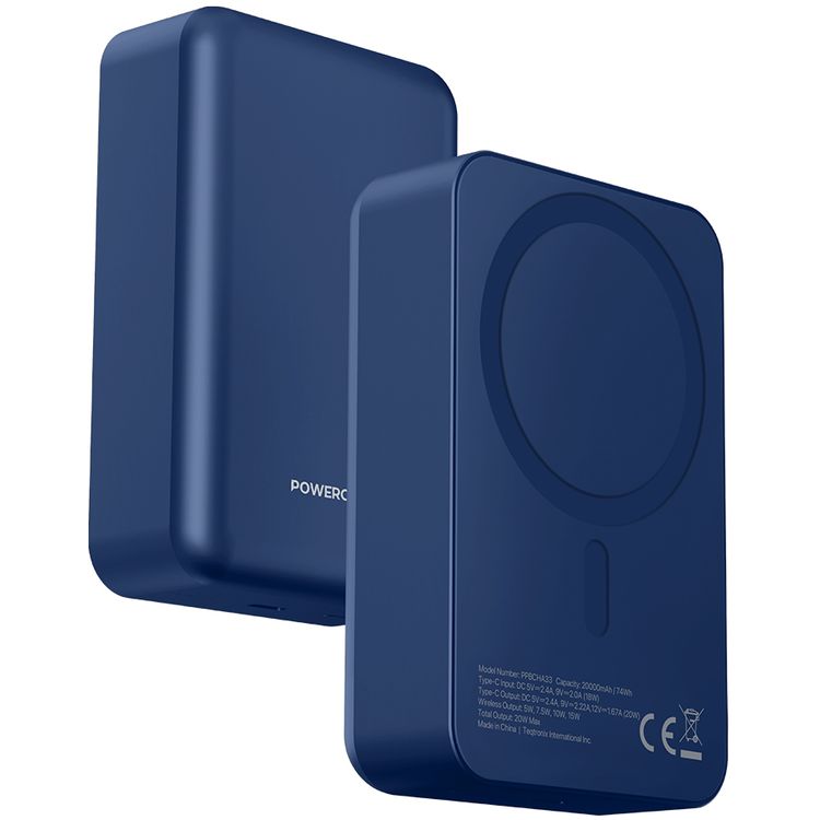 باورولوجي سبيتانوس 20000 مللي أمبير ساعة ماج سيف بطارية ألمنيوم مع مؤشر مستوى البطارية، تصميم خفيف الوزن ومضغوط، شحن سريع ومتزامن، مدخل ومخرج من النوع سي، إخراج لاسلكي 15 واط - أزرق.