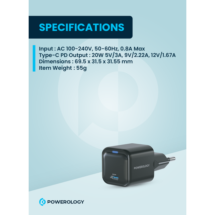 شاحن باورولوجي فائق الصغر 20 واط بتقنية جان PD للاتحاد الأوروبي، تصميم مدمج، شحن سريع، سطح غير لامع، حماية من السخونة الزائدة، وفائض الجهد، والشحن الزائد، منفذ USB-C - أسود