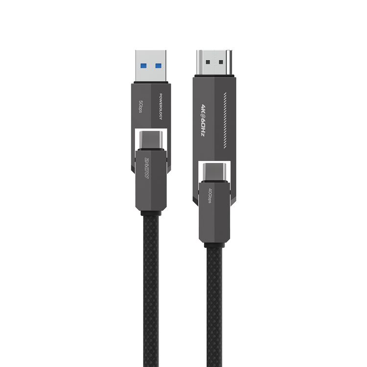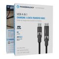 كابل باورولوجي فيون 4 في 1 للشحن ونقل البيانات بسرعات نقل بيانات تصل إلى 40 جيجابت في الثانية، بطول 1.2 متر، خالٍ من التشابك، يتميز بغلاف من سبيكة الزنك، شحن عالي السرعة، موصلات إدخال USB-C وUSB-A - أسود