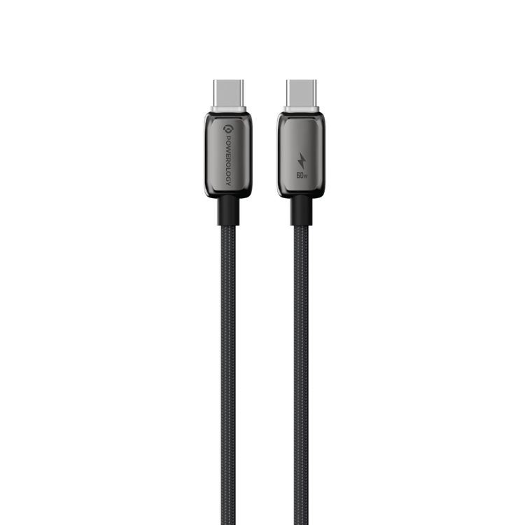 كابل Powerology Zinco Series USB-C إلى USB-C مع تقنية PD 60 وات، شحن عالي السرعة، طول الكابل 1 متر، مصنوع من النايلون المضفر ومادة سبائك الزنك، سرعة نقل بيانات 480 ميجابت في الثانية - رمادي