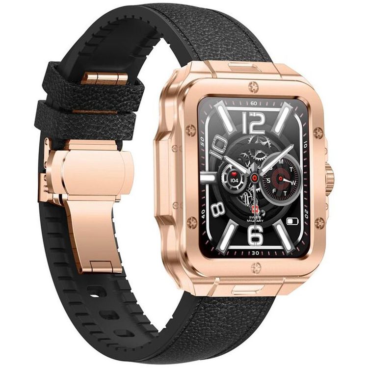 ساعة سويس ميليتاري ألبس 2، شاشة عالية الدقة مقاس 1.85 مم، ذاكرة مدمجة 4 جيجابايت، اكتشاف التمرين، مراقبة ضغط الدم ومستوى الأكسجين، إجراء واستقبال المكالمات - إطار روز جولد وحزام جلدي أسود