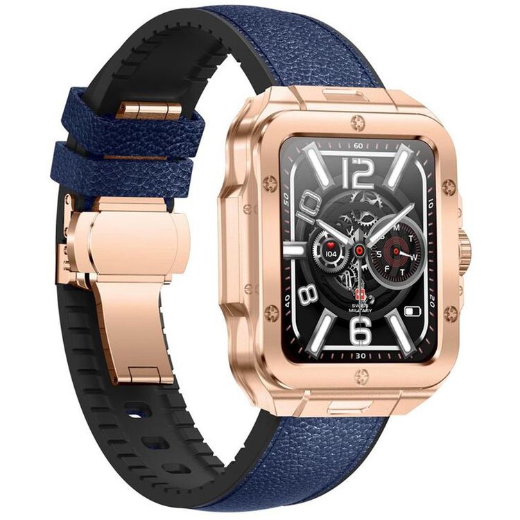 ساعة سويس ميليتاري ألبس 2، شاشة عالية الدقة مقاس 1.85 بوصة، ذاكرة مدمجة 4 جيجابايت، اكتشاف التمرين، مراقبة ضغط الدم ومستوى الأكسجين، إجراء واستقبال المكالمات - إطار روز جولد وحزام جلدي أزرق