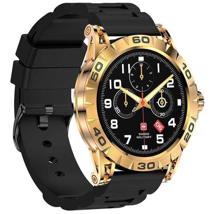 ساعة Swiss Military Dom2، عمر بطارية يصل إلى 7 أيام، استقبال وإجراء مكالمات، مراقبة معدل ضربات القلب وضغط الدم ومستوى الأكسجين، iOS وAndroid - ذهبية مع حزام سيليكون أسود