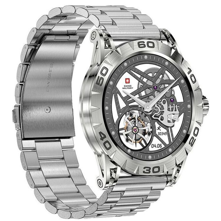 ساعة Swiss Military Dom2، عمر بطارية يصل إلى 7 أيام، استقبال وإجراء مكالمات، مراقبة معدل ضربات القلب وضغط الدم ومستوى الأكسجين، iOS وAndroid - فضية مع حزام معدني