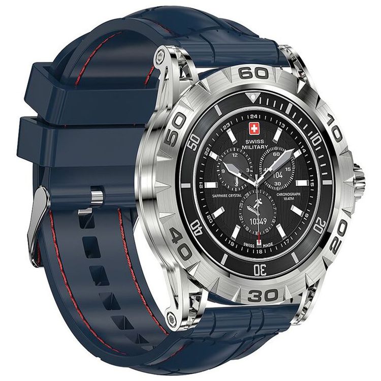 ساعة Swiss Military Dom2، عمر بطارية يصل إلى 7 أيام، استقبال وإجراء مكالمات، مراقبة معدل ضربات القلب وضغط الدم ومستوى الأكسجين، iOS وAndroid - فضي مع حزام سيليكون أزرق