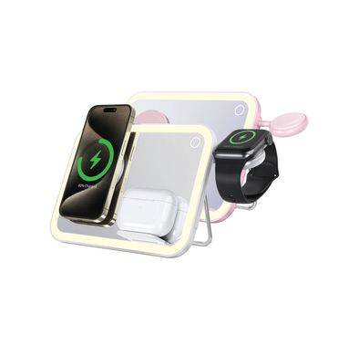 Free ShippingPorodo Multi-Device Wireless Charging Mirror with LED Night Light, Adjustable Stainless Steel Stand, 10W MagSafe Output, 5W Earbuds Output, 3W Watch Output, 0-40°C Operating Temperature - PinkStock149.00