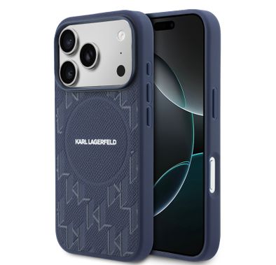 Karl Lagerfeld MagSafe Full Wrapped Leather Case with KL Monogram for iPhone 17 Pro, Slim Profile, Drop Protection, Lightweight, Comfortable Grip - Navy
