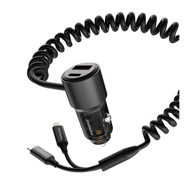 Porodo 95W Car Charger, USB-A & C Ports, 12-24V Input, 1.5m Spring Coiled Cable, Integrated USB-C & Lightning Cables - Black70.00