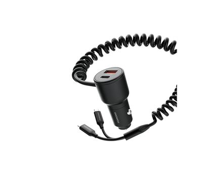 Porodo 110W Car Charger, USB-A+C Ports, 12-24V Input, 1.5m Spring Coiled Cable, Integrated USB-C Cable - Black70.00