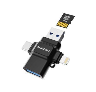 Porodo 4-in-1 USB 3.0 OTG Adapter with Type-C & Lightning Connectors, TF Card Reader, Fast Data Transfer, Plug & Play, Universal Compatibility, Micro SD, Micro SDHC, Micro SDXC, TF Card Compatibility - Black40.58