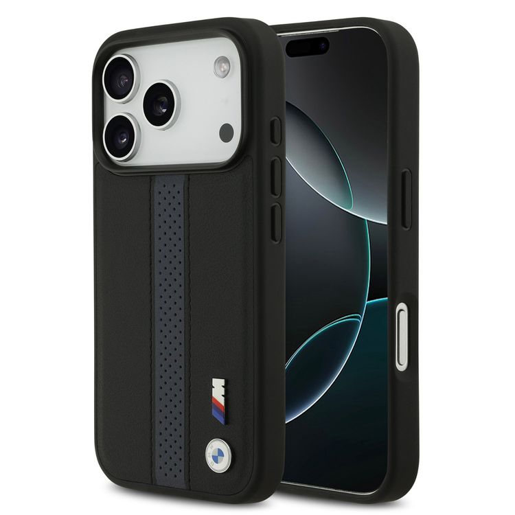 BMW PU Leather Case with Perforated Stripes & Metal Logos for iPhone 17 Pro Max, MagSafe Compatible, Sustainable Packaging, Drop Protection, Slim Profile, Easy Snap-On Design - Black / Blue