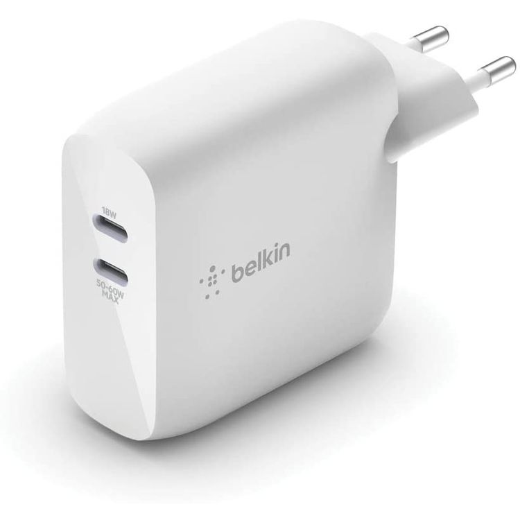 Dual USB-C Charger Belkin WCH003vfwh Dual USB-C GaN Wall Charger 63W - White Experience next-level charging with advanced GaN technology. This powerful addition to our charging family offers fast charging for multiple devices in an unusually compact and convenient size. Gallium nitride (GaN) is a high-performance alternative to the traditional silicon used in charging devices. GaN transistors produce less heat, allowing components to be closer together, which means you get a much smaller charger with all the power of a big one.