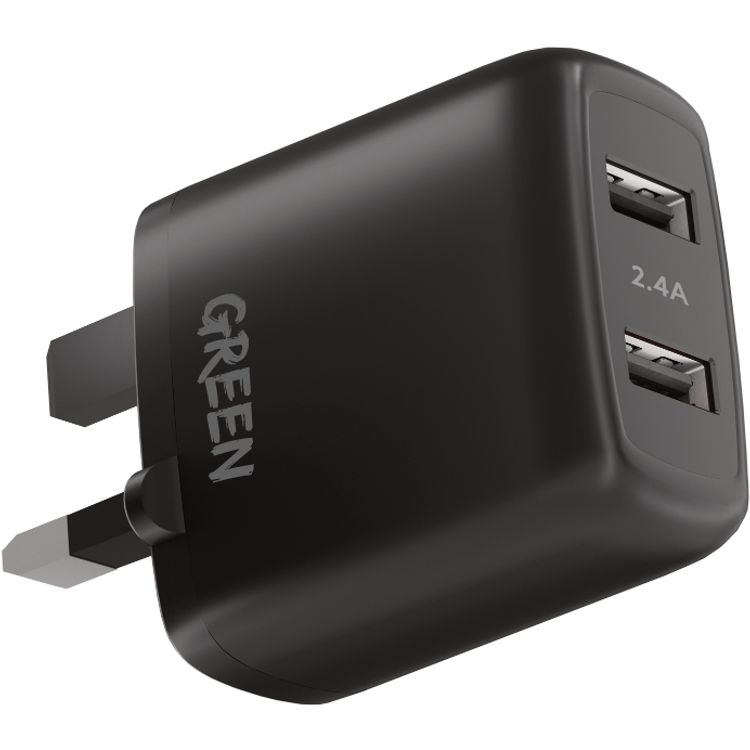 Green Lion Dual USB Port Wall Charger with 12W Total Output Power, UK 3-Pin Plug, Overheat & Overvoltage Protection, Fast Charging & Auto-ID Support - Black