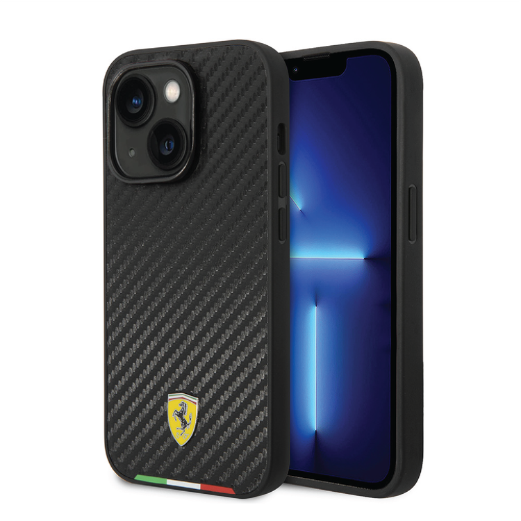 Ferrari HC PU Carbon Effect Case with Italian Flag Line iPhone 14 Compatibility - Black