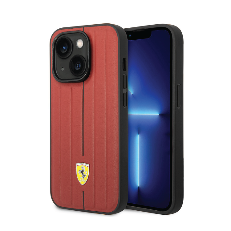 Ferrari Leather Case With Embossed Stripes & Yellow Shield Logo - iPhone 14 - Red