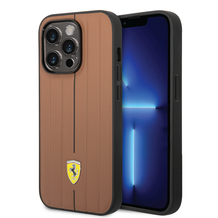 Ferrari Leather Case With Embossed Stripes & Yellow Shield Logo - iPhone 14 Pro - Camel