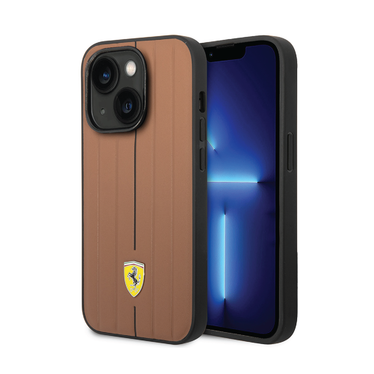 Ferrari Leather Case With Embossed Stripes & Yellow Shield Logo - iPhone 14 Plus - Camel