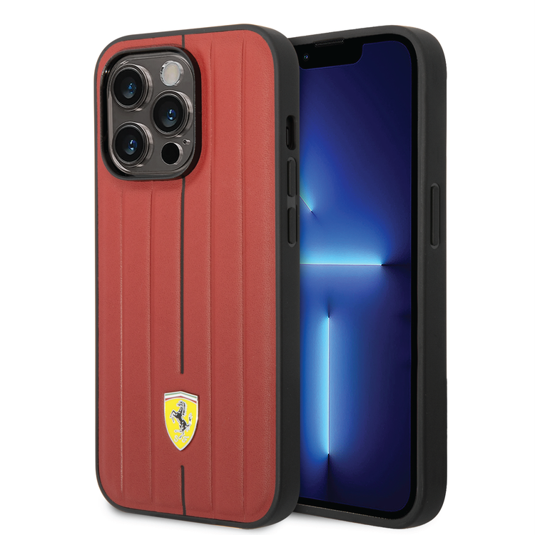 Ferrari Leather Case With Embossed Stripes & Yellow Shield Logo - iPhone 14 Pro Max - Red