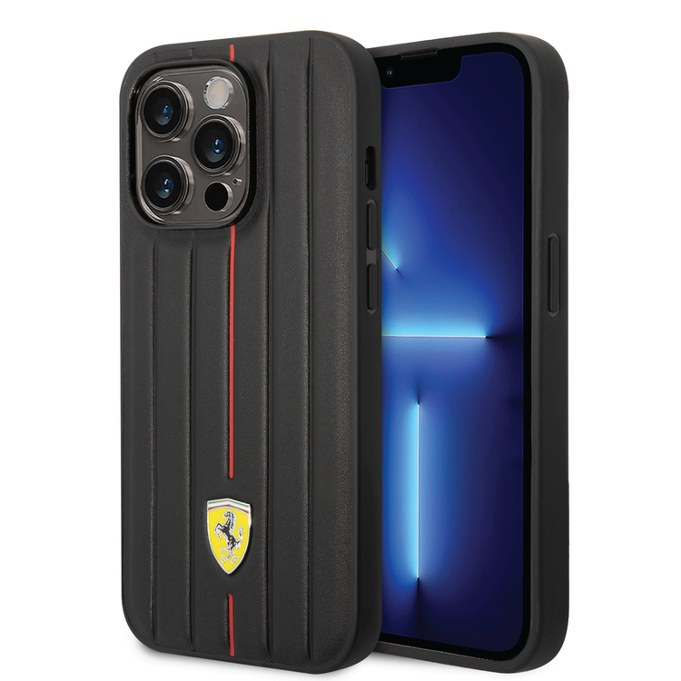 Ferrari Leather Case With Embossed Stripes & Yellow Shield Logo - iPhone 14 Pro - Black