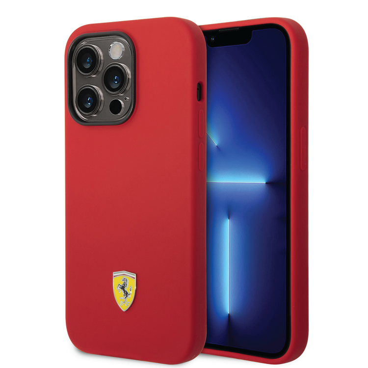 Ferrari Liquid Silicone Case with Black Camera Outline & Metal Logo iPhone 14 Pro Compatibility - Red