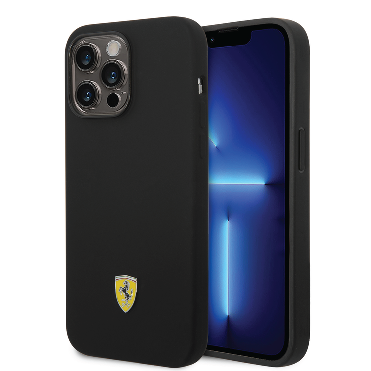 Ferrari Liquid Silicone Case with Black Camera Outline & Metal Logo iPhone 14 Pro Max Compatibility - Black