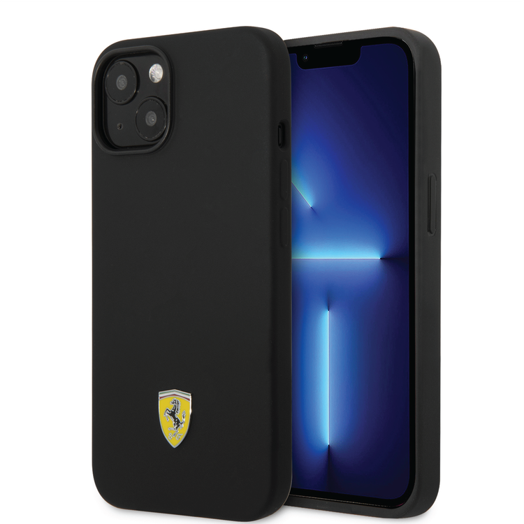 Ferrari Liquid Silicone Case with Black Camera Outline & Metal Logo iPhone 14 Compatibility - Black