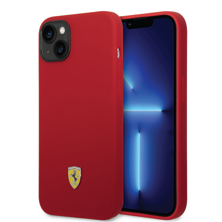 Ferrari Liquid Silicone Case with Black Camera Outline & Metal Logo iPhone 14 Plus Compatibility - Red